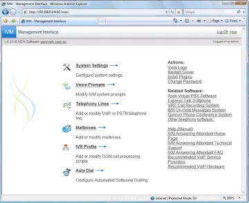 IVM puede ser usado también para una amplia variedad de soluciones desde un contestador automático computarizado simple hasta un sofisticado sistema de respuesta de voz interactiva. Simplemente ejecute el archivo de instalación y IVM estará lista para responder las llamadas. Luego, cuando esté listo, puede explorar las opciones de programación y respuestas claves avanzadas.