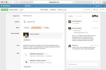 Con Podio tanto si estás terminando un proyecto de diseño o cerrando un lead de ventas, tener todo lo relacionado con el trabajo en un único lugar hace que colaborar sea instantáneamente más fácil. Adjunta archivos, añade comentarios, revisa el estatus… y todo ello actualizado en tiempo real.